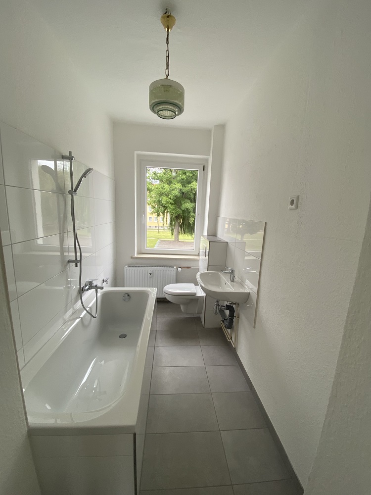 Die Wände der Wohnung sind mit weißer Raufasertapete gestaltet und sorgen für eine helle, freundliche Atmosphäre. Das Badezimmer wurde vollständig erneuert, modern gefliest und mit einer Badewanne sowie einem WC mit Vorwandmontage ausgestattet.