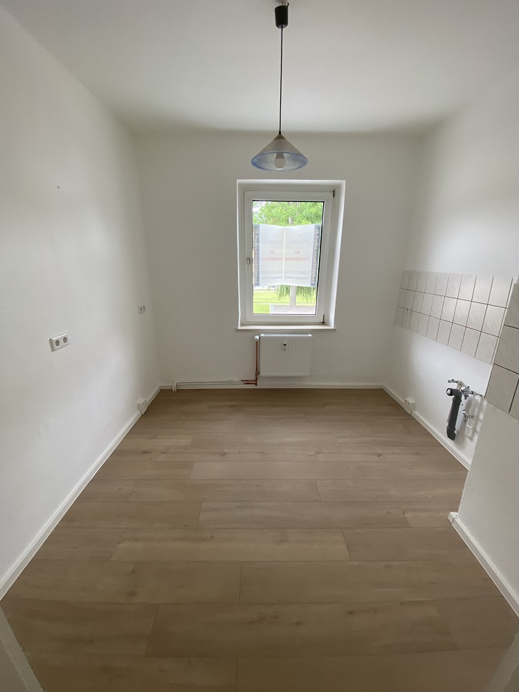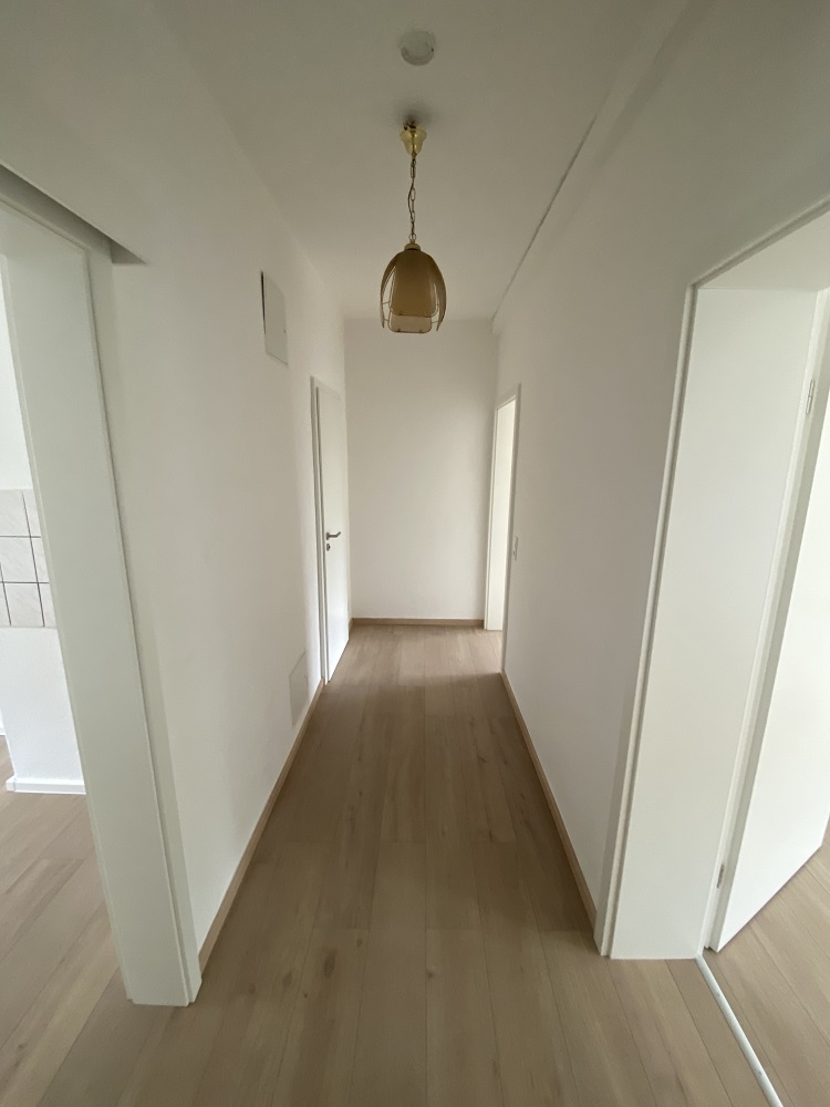 In allen Wohnräumen, einschließlich Küche und Flur, wurde ein hochwertiger Laminatboden verlegt, der nicht nur stilvoll aussieht, sondern auch pflegeleicht ist. Neue weiße Innentüren runden das moderne Erscheinungsbild der Wohnung harmonisch ab.